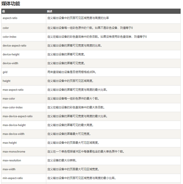 Media Type(判断条件) + CSS属性(符合条件的样式规则) = Media Features(媒体特性) - 媒体特性书写时必须加括号